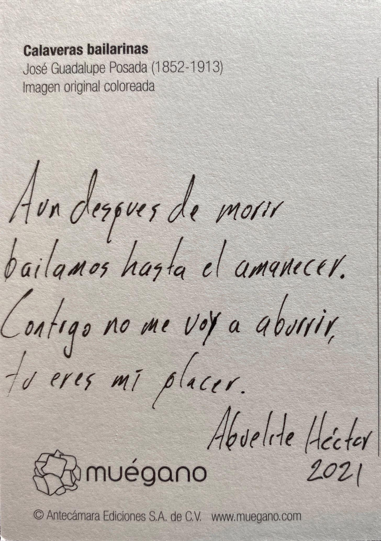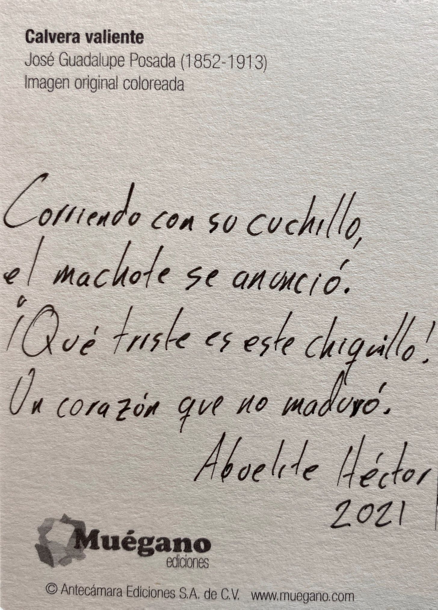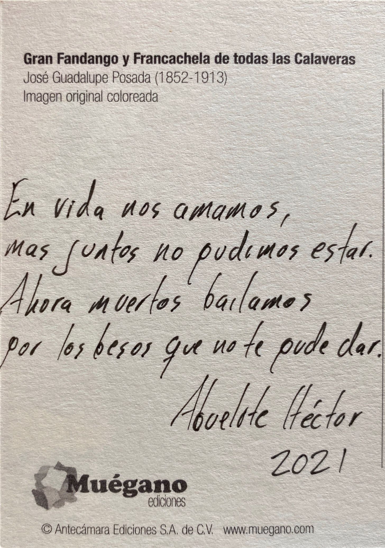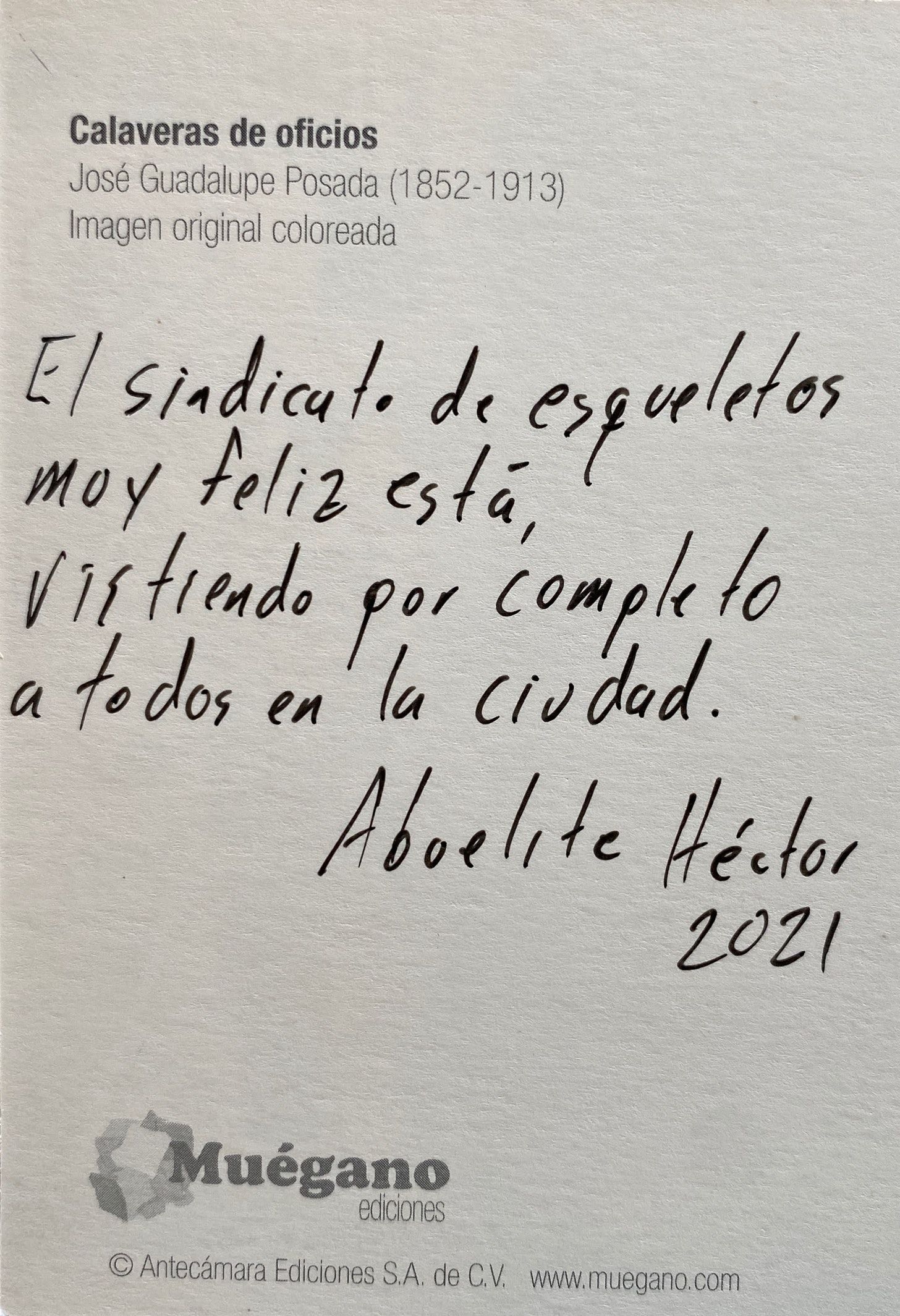 On my last trip to Mexico City, I found these postcards with the art of José Guadalupe Posada. These images depict skeletons, not as frozen reminders of our mortality but as vivacious and lively entities. Posada’s art celebrated our dearly departed as the people we knew. His work would influence Diego Rivera and lead to the iconic calavera catrina.
