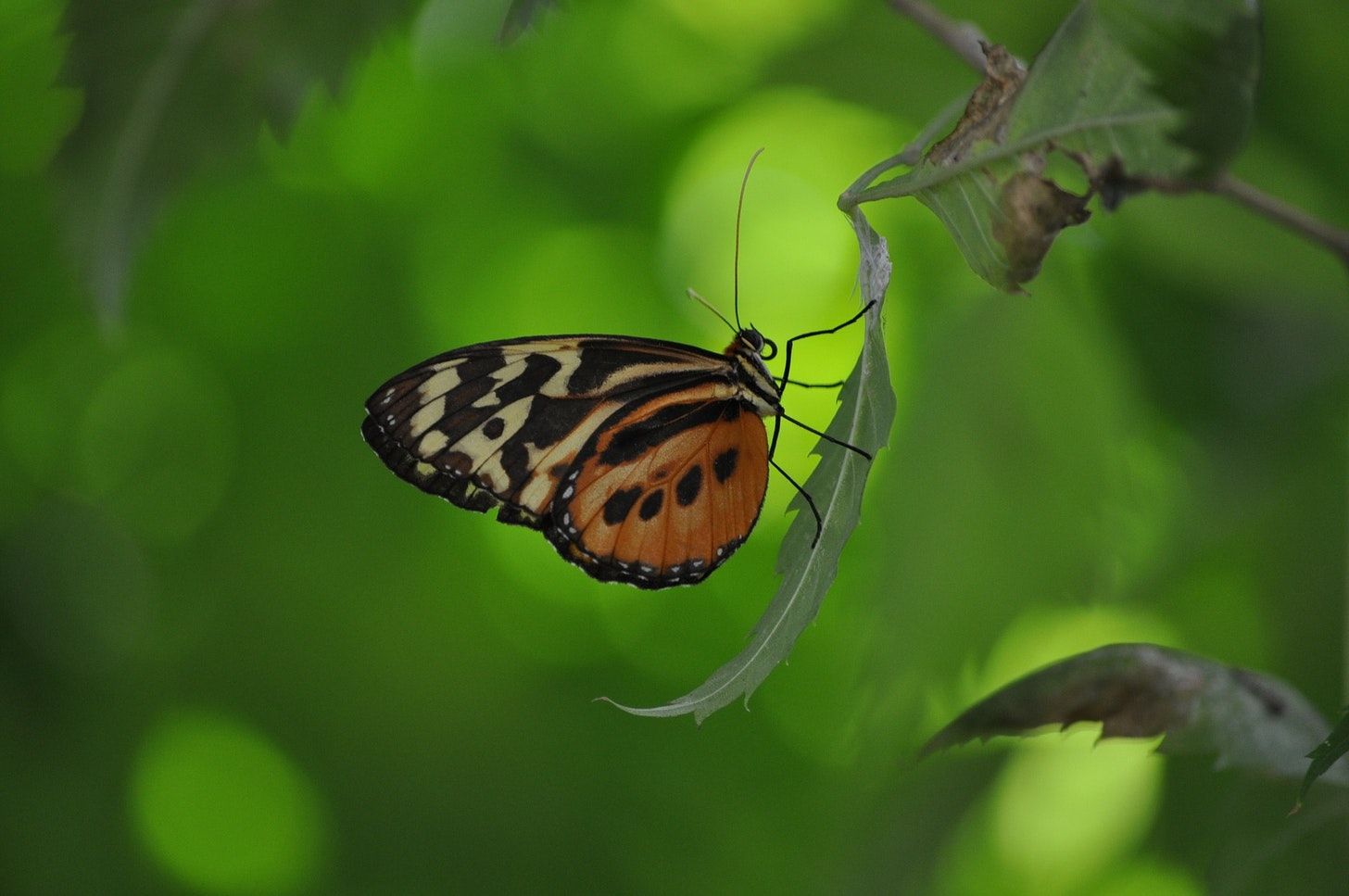 Image description: A black and orange butterfly (post-transformation) perches on a green leaf.