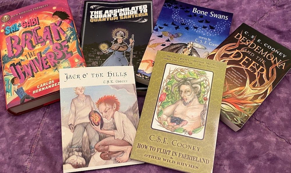 Image Description: Sal and Gabi Break the Universe and The Assimilated Cuban’s Guide to Quantum Santeria by Carlos Hernandez and Jack O’ the Hills, How to Flirt in Faerieland and Other Wild Rhymes, Bone Swans, and Desdemona and the Deep by C. S. E. Cooney.