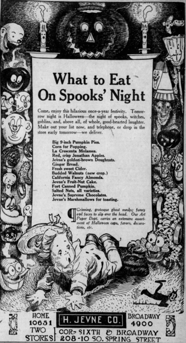 Image Description: A newspaper ad from October 30th, 1919 featuring a jack o’lantern and assorted ghouls hilarioursly chasing a terrified child.