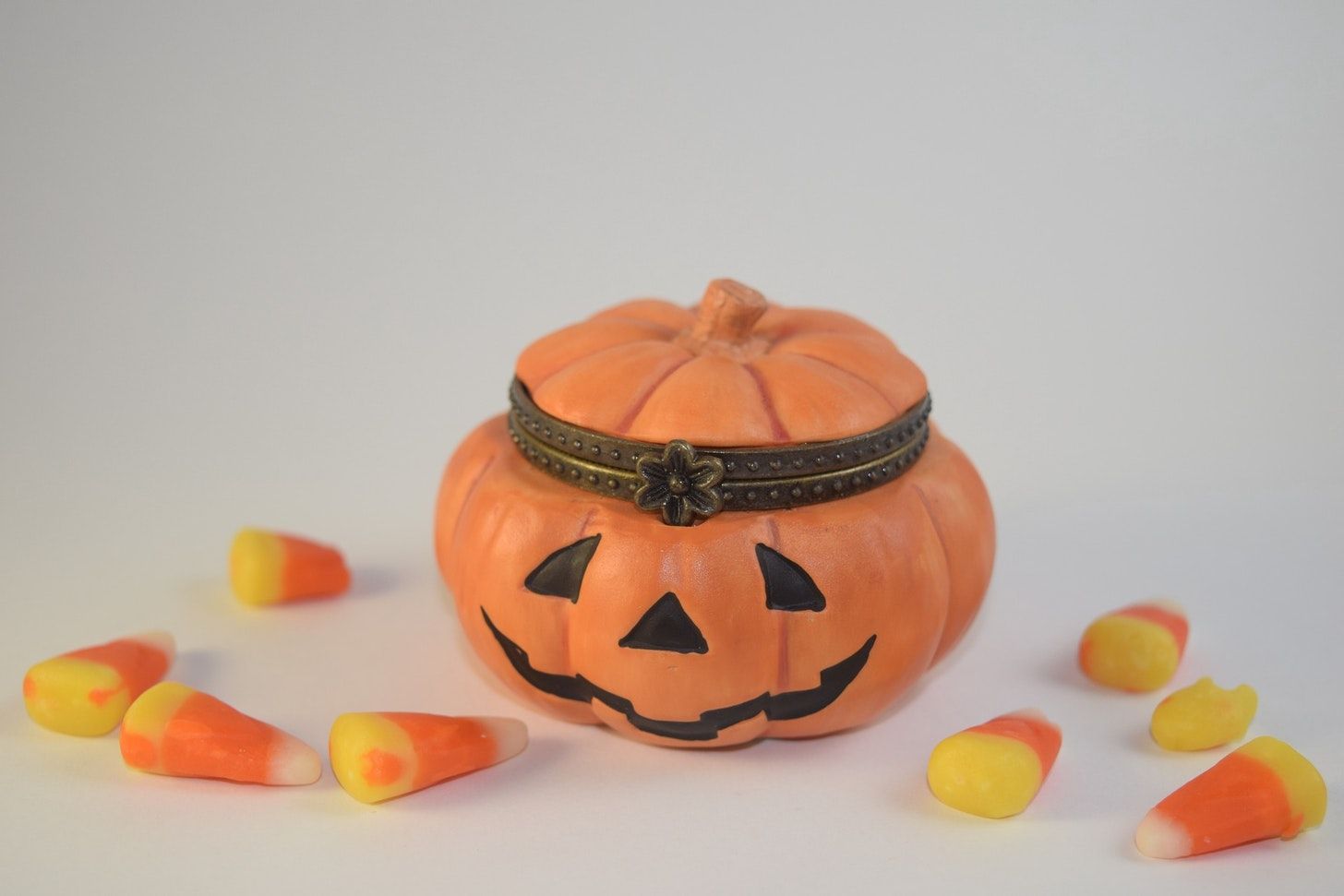 Image Description: A porcelain pumpkin box with candy corn artfully scattered around it.