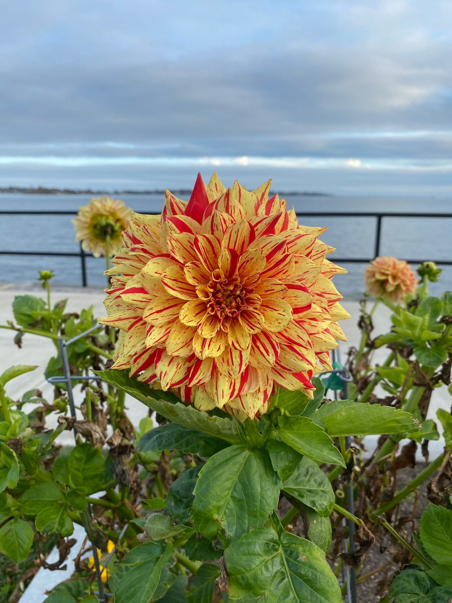 Image description: variegated red and yellow dahlias with the ocean in the background.
