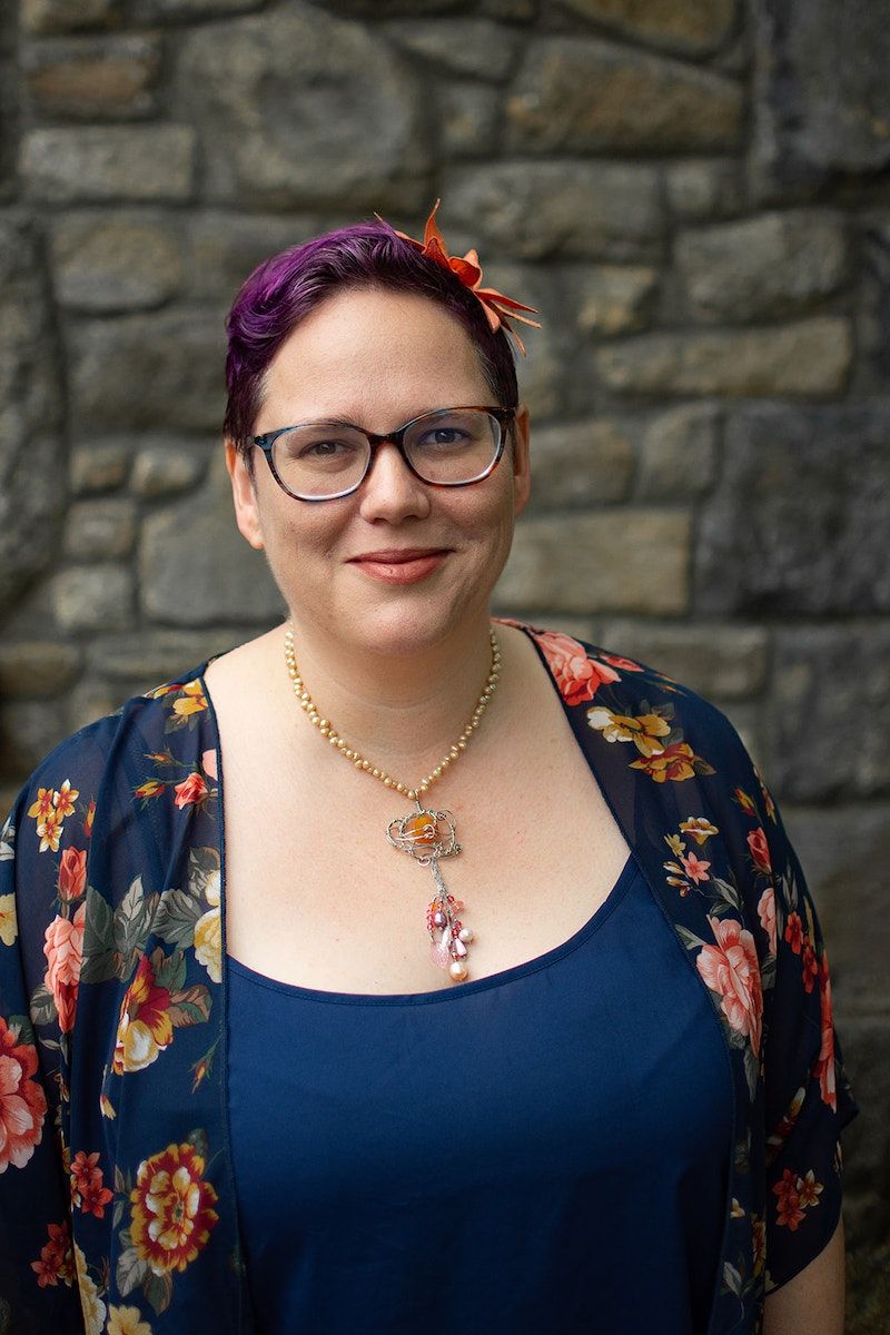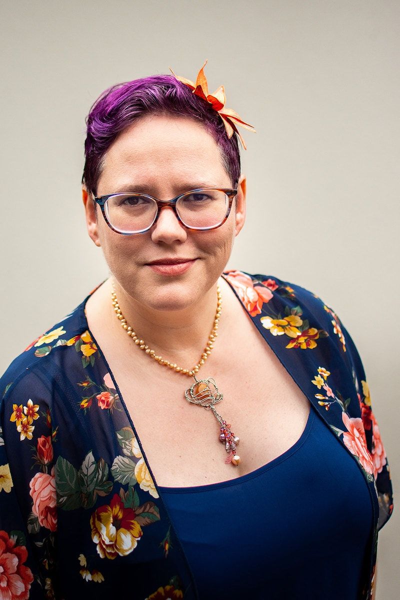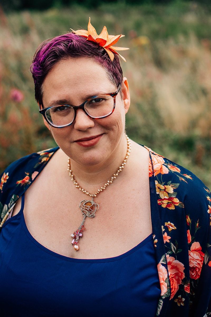 Image description: the same pose as the photo I ultimately chose for my default author photo for right now, except in this one I am looking a little more seriously into the camera instead of off camera to wherever it is that impish ideas come from.