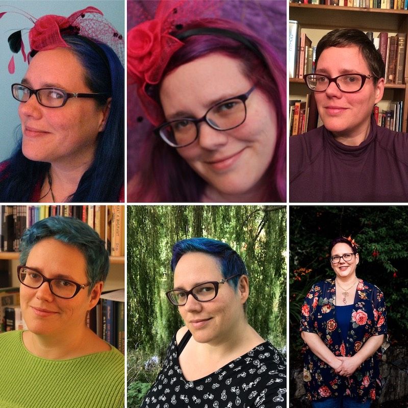 Image description: 6 versions of me! Top left in 2012 with long blue hair and a hot pink fascinator headband taken against a blue wall. Top middle in 2014 with long purple hair and the same pink fascinator taken against a purple background. Top Right in 2016 with short brown hair and a purple turtleneck taken in front of a bookcase. Bottom left in 2016 with short turquoise hair and a lime green sweater taken in front of the same bookcase. Bottom middle in 2017 with short blue hair and a black top with white bicycles on it taken in front of green weeping willow branches. Bottom right in 2019 with short purple hair, an orange flower fascinator, and a navy top with predominantly orange hued flowers on it taken in front of some bushes. The bottom right is copyright Marie O’Mahony Photography. All the others I took myself.