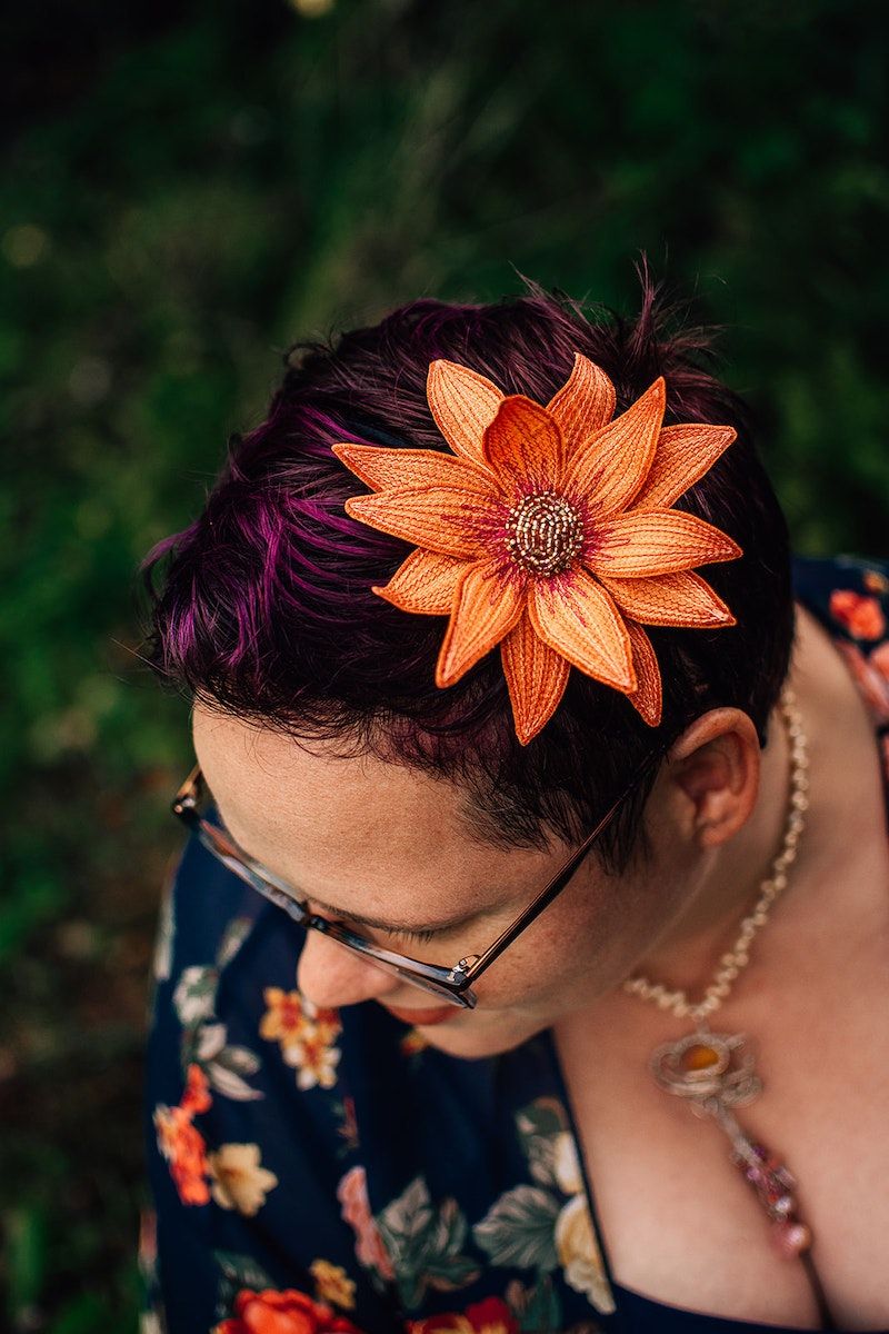 Image description: closeup of my hair flower, made by Betsie Withey! Betsie is incredibly talented, and you can buy her textile art at her Etsy shop!