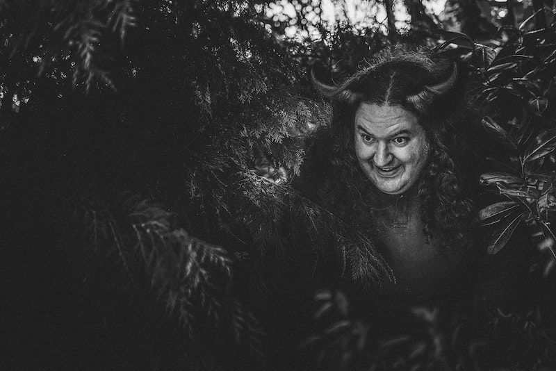 Image description: Black and white photo of Moss as a horned fairy creature emerging from the woods. This is entirely silly and I love it!