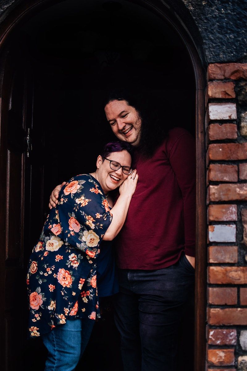 Image description: Me on the left and Moss on the right hugging and laughing in a doorway. I love this because we spend a lot of our time laughing together.