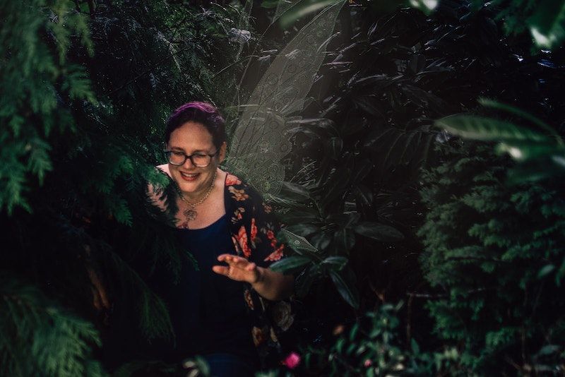 Image description: Me as a winged fairy in the woods. I like how my hand is slightly blurry here, implying that maybe, like a hummingbird, my fairy self is moving too fast to be captured in sharp focus. I don’t think Marie does this kind of thing for most people, but since she knew we were friends of Claire’s she let her whimsical impulses out to play.